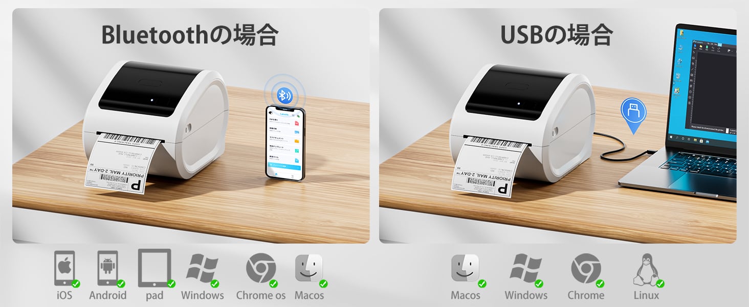 「スマホとパソコン両方接続可能」D520-BTは、BluetoothおよびUSB接続に対応したサーマルラベルライターです。スマートフォンでの接続には、Google PlayまたはApple Storeから「Labelife」アプリをダウンロードし、iPhone、iPad、またはAndroid携帯電話のBluetoothをオンにして本体とペアリングするだけで簡単に行えます。また、パソコン接続についても、PC、Windows、Mac、Linux、Chromeに対応しており、PC印刷にはドライバーのダウンロードが必要となります。詳しい操作方法については、日本語の取扱説明書をご確認いただけます